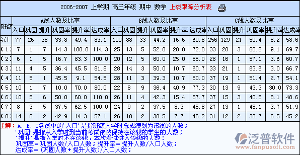 ?、苌暇€跟蹤: 通過(guò)班級(jí)當(dāng)前成績(jī)與入學(xué)時(shí)的成績(jī)進(jìn)行比較和分析而產(chǎn)生的鞏固率、提升率和達(dá)成率等教學(xué)指標(biāo),跟蹤分析高中文理科ABC上線情況,從而精確衡量各班級(jí)各學(xué)科的教學(xué)質(zhì)量進(jìn)步狀況,為日常教學(xué)提供一定的參照依據(jù)。下圖舉例分析,1班原先處于A線學(xué)生有7人,該次考試A線人數(shù)有8人,其中有7人是提升上來(lái)的,但原來(lái)A線中7人只保持住了1人,此時(shí)我們就應(yīng)該對(duì)其他流失的6人分的去向分析原因,應(yīng)從教師的教學(xué)方法、教學(xué)管理和學(xué)生自身等方面尋找原因進(jìn)行分析。