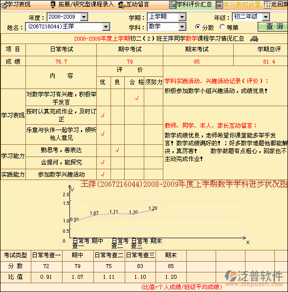 學(xué)科評(píng)價(jià)學(xué)生過(guò)程性的學(xué)科平時(shí)成績(jī)、期中、期末成績(jī)和學(xué)期總評(píng)成績(jī)以及各學(xué)科的進(jìn)步狀況曲線圖,學(xué)科學(xué)習(xí)表現(xiàn)、學(xué)習(xí)能力、實(shí)踐能力等內(nèi)容設(shè)定,學(xué)生學(xué)科表現(xiàn)內(nèi)容、興趣愛(ài)好、拓展、研究型課程和各學(xué)科的教師、學(xué)生、同學(xué)、家長(zhǎng)互動(dòng)交流的記錄以及各學(xué)科的綜合評(píng)價(jià)匯總