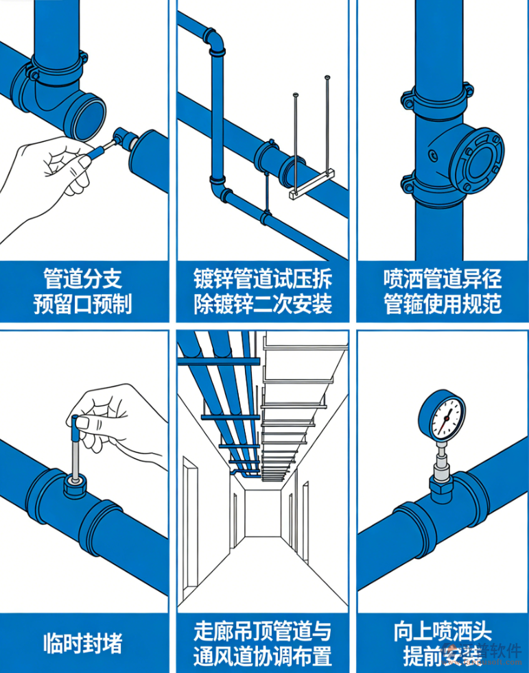 管道的分支預(yù)留口在吊裝前應(yīng)先預(yù)制好,絲接的用三通定位,預(yù)留口焊接的可在干管上開(kāi)口焊上,熟鐵管箍直后吊裝所有預(yù)留口均加好臨時(shí)堵;需要加工鍍鋅的管道在其它管道未安裝前試壓拆除鍍鋅后,進(jìn)行第二次安裝:走廓吊頂內(nèi)的管道安裝與通風(fēng)道的位置要協(xié)調(diào)好;噴灑管道管徑不宜采用補(bǔ)心,應(yīng)采用異徑管箍,彎頭上不得用補(bǔ)心,應(yīng)采用異徑彎頭,三通上,最多用一個(gè)補(bǔ)心,四通上,最多用兩個(gè)補(bǔ)心;向上噴灑頭有條件的,可志分支干管順序安裝好,其它管道安裝完成后不易操作的位置也自學(xué)成才先安裝好向上噴的噴灑頭;