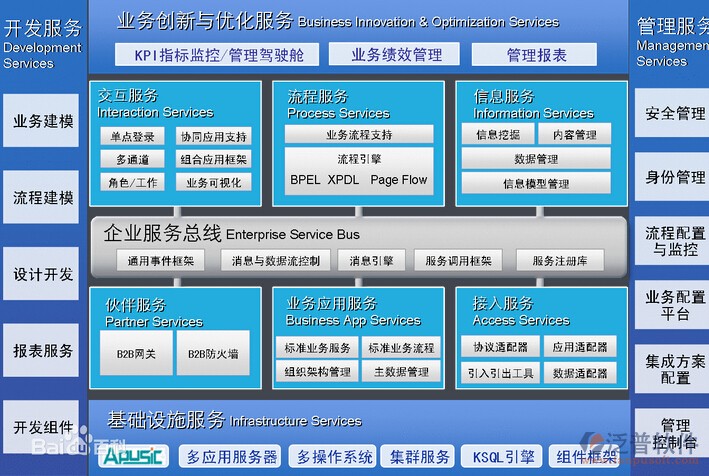 實現(xiàn)了部署與系統(tǒng)監(jiān)控、集成方案定義、數(shù)據(jù)轉(zhuǎn)換定義、流程配置與監(jiān)控的SOA運營管理體系。