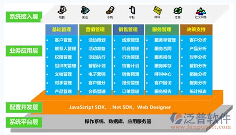 2. 配置開發(fā)層:提供JavaScript SDK、.Net SDK、Web Designer等多種配置工具,實(shí)現(xiàn)了CRM系統(tǒng)前臺界面和后臺業(yè)務(wù)的隨需而變。