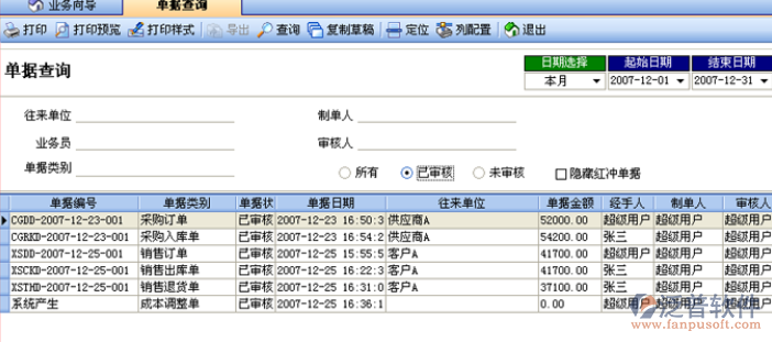 7、單據(jù)查詢:這個報表是貫穿整個經(jīng)營過程的報表,通過它可以查詢到系統(tǒng)中任何一張原始報表單據(jù)。