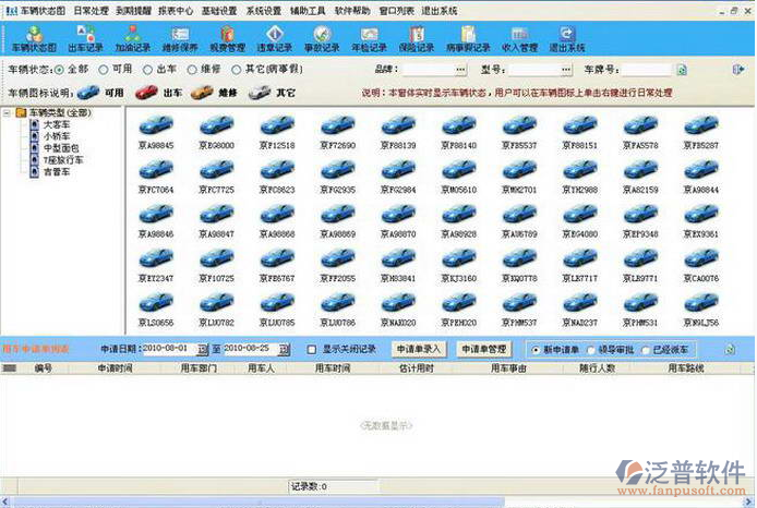 泛普軟件車輛管理軟件,車輛管理系統(tǒng)主要功能有駕駛員檔案、車輛檔案管理、油卡管理、配件信息、車輛狀態(tài)圖管理(駕駛員狀態(tài))、用車申請(qǐng)管理(可短信通知)、車輛出車管理、車輛加油管理、車輛維修管理、車輛規(guī)費(fèi)管理、車輛保養(yǎng)管理、車輛違章管理、車輛事故管理、車輛年檢管理、車輛保險(xiǎn)管理、病事假管理、車輛收入管理、短信管理等,并有車輛年檢到期提醒、車輛保險(xiǎn)到期提醒、車輛保養(yǎng)到期提醒、車輛規(guī)費(fèi)到期提醒、駕照到期提醒(可短信通知),可導(dǎo)入Excel格式的職員檔案、車輛檔案、加油記錄,可分車隊(duì)管理車輛,是高效的車輛管理軟件,車輛管理系統(tǒng)。
