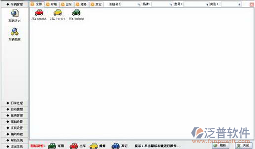 《泛普軟件泛普OA系統(tǒng)車隊管理系統(tǒng)》主要功能車輛檔案管理、司機檔案管理、違章記錄、年審記錄、年檢記錄、保險記錄、維修記錄、保養(yǎng)記錄、加油記錄、規(guī)費記錄、出車記錄等全面管理,并提供到期年檢提醒、保險到期提醒、保養(yǎng)提醒、駕照年審提醒、規(guī)費到期提醒等智能預警功能,是車輛管理員高效的管理工具。