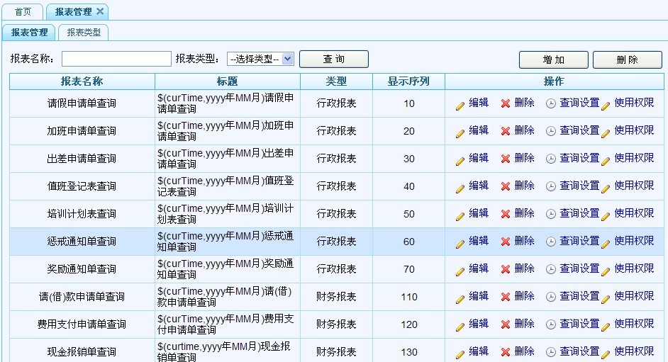 報表管理,包括報表、報表類型的增加、刪除,查詢設(shè)置以及報表的使用權(quán)限。