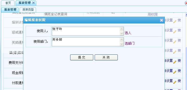 (只有超級管理員有權(quán)限)指定某個人或者某個部門有權(quán)限使用某個報表。