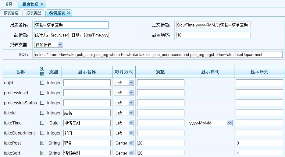 編輯報表包括報表名稱、正文標題、副標題、顯示順序、關(guān)聯(lián)設(shè)置(流程分類、表單)、報表類型、SQL語句以及字段的定義。