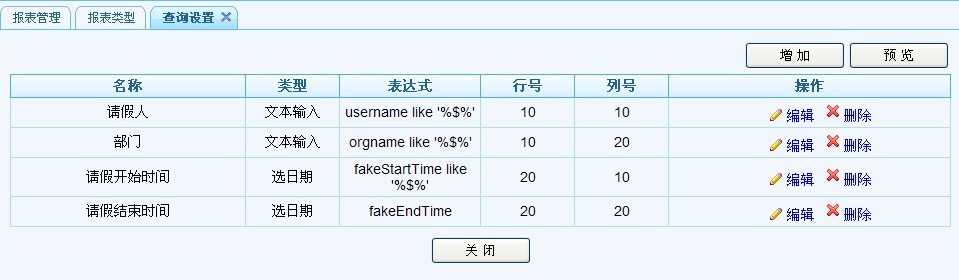 報表管理包括增加、修改、刪除、查詢設(shè)置以及使用權(quán)限的額設(shè)置,顯示所有報表的列表。