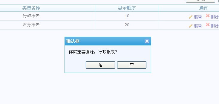 選擇要刪除報表類型,點擊刪除,彈出二次確認框,確認刪除,點擊“是”;反之點擊“否”。
