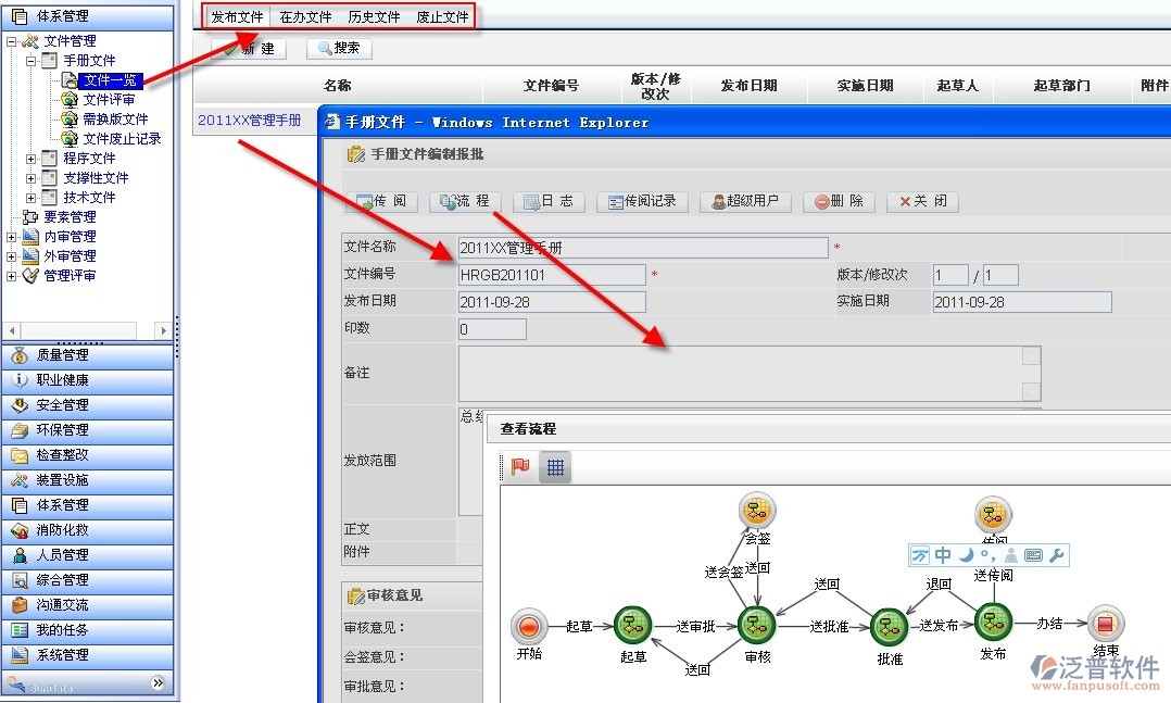 文件管理系統(tǒng)主要實(shí)現(xiàn)手冊文件、程序文件、支撐性文件、技術(shù)文件的起草、審批、批準(zhǔn)、評審、修訂、換版、廢止的全過程控制,其特點(diǎn)包括:- 文件管理全過程的線上處理,便于跟蹤,提高效率;