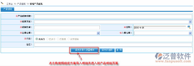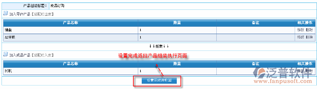 新增完明細(xì)以后,點(diǎn)擊【設(shè)置完成并返回】返回組裝列表,然后點(diǎn)擊此行數(shù)據(jù)后的【執(zhí)行】進(jìn)入組裝確定頁(yè)面