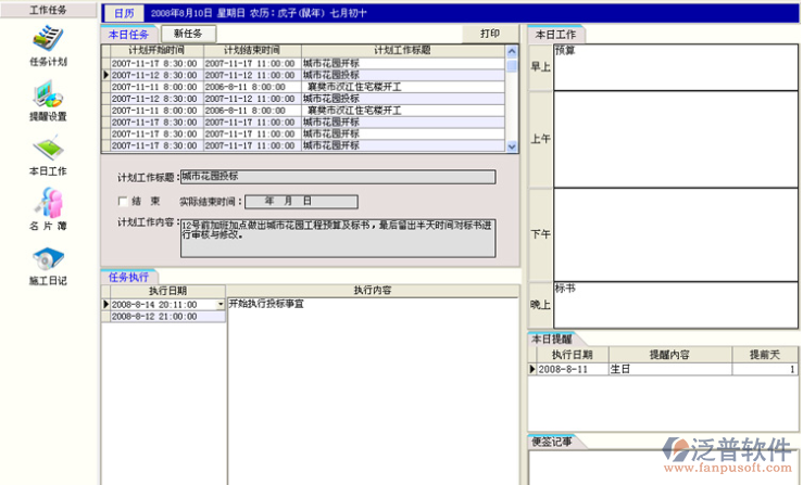 在本日工作窗口中可即時了解當天的工作、當天的提醒、并可填入當天工作的進展情況及當天的工作日記,并有便箋用于記錄其它事項,是項目經(jīng)理的好秘書;