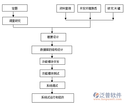 正如研究任何其它軟件項目一樣,我做的畢業(yè)設(shè)計也經(jīng)歷了從選題,調(diào)研,熟悉開發(fā)環(huán)境,實驗關(guān)鍵技術(shù),查找類似的相關(guān)系統(tǒng)的資料;系統(tǒng)概要設(shè)計,數(shù)據(jù)庫結(jié)構(gòu)設(shè)計,功能模塊開發(fā),功能模塊測試,系統(tǒng)調(diào)試和系統(tǒng)試運行和修改。下面的流程圖反映了我們的基本的思路和過程。
