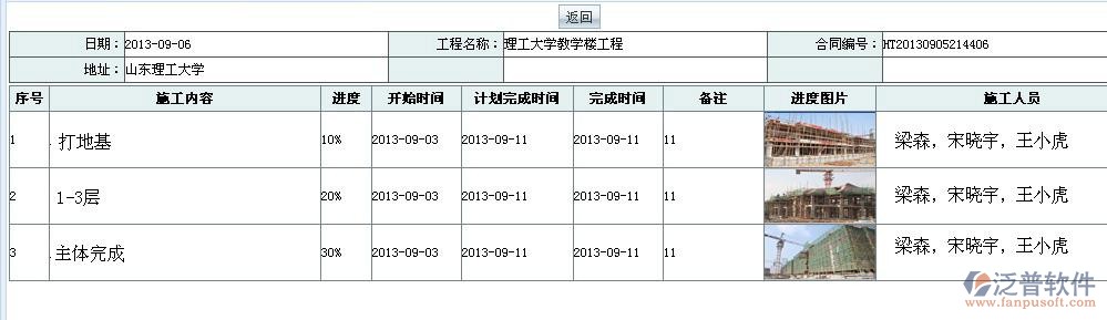 施工進(jìn)度:管理人員可以即使了解工程人員進(jìn)度,附帶進(jìn)度圖片??梢灾庇^的了解工程進(jìn)度,根據(jù)工程進(jìn)度的完成情況制定人員分配計(jì)劃。