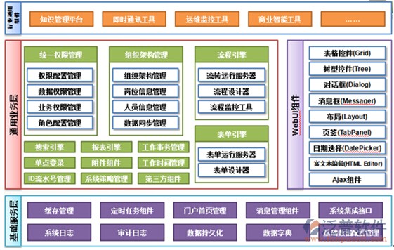 在通用業(yè)務(wù)層,系統(tǒng)包括了權(quán)限管理、組織架構(gòu)管理、流程引擎、表單引擎等功能,同時系統(tǒng)通過自身嚴格的權(quán)限控制和組織流程管理機制,提高系統(tǒng)自身的內(nèi)部關(guān)聯(lián)和調(diào)整維護的便捷性;