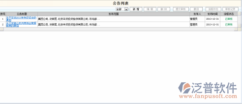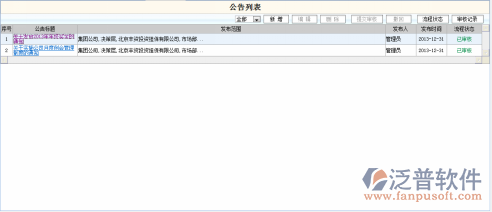 登錄項(xiàng)目管理系統(tǒng),點(diǎn)擊功能菜單,日常辦公->電子公告->公告管理,系統(tǒng)轉(zhuǎn)入公告管理信息列表,系統(tǒng)瀏覽窗口如下: