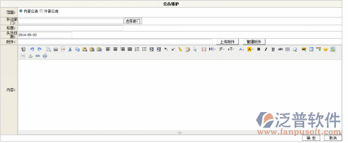 ”,點(diǎn)擊“確定”功能按鈕,部門添加成功。失效日期是此公告信息什么時間不可用。公告內(nèi)容可以轉(zhuǎn)換為‘HTML’格式。輸入公告內(nèi)容信息,信息輸入無誤后點(diǎn)擊“保存”功能按鈕,公告添加成功;