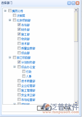 圖-<公告管理.新增>,公告范圍包括“內(nèi)部公告”和“外部公告”,內(nèi)部公告只對公司內(nèi)部人員可見,外部公告對公司內(nèi)部和以外的人員都可見,選擇部門為此公告授權(quán),把公告內(nèi)容公開到具體部門,點(diǎn)擊“選擇部門”功能按鈕,系統(tǒng)彈出界面如下圖: