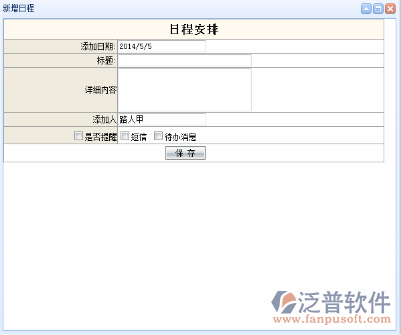 在圖-<我的日程.瀏覽>中,當(dāng)前用戶可以根據(jù)自身的工作安排設(shè)置日程列表,通過短信或者消息的形式來提醒。點(diǎn)擊左上角的日期列表,查看相應(yīng)日期下的日程安排信息,并對(duì)日程的安排信息進(jìn)行修改和刪除操作,有紅色標(biāo)記的日期說明當(dāng)前日期下有日程安排信息;在左上角的日期列表中選擇一個(gè)特定的時(shí)間日期,在日期上點(diǎn)擊“左鍵”,系統(tǒng)將進(jìn)入對(duì)這一天的日程安排新增列表如下圖: