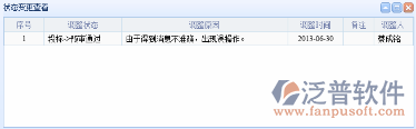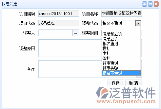 在圖-<狀態(tài)變更>中,可以看到目前項(xiàng)目所處的狀態(tài),根據(jù)實(shí)際情況調(diào)整到其他狀態(tài),選擇調(diào)整人、填寫調(diào)整原因、調(diào)整日期,點(diǎn)擊“保存”,然后提交審核,經(jīng)公司相關(guān)人員審核,項(xiàng)目狀態(tài)即發(fā)生變更。處于流程狀態(tài)之中的記錄,可以進(jìn)行狀態(tài)變更,一旦變更,其他統(tǒng)計(jì)信息也隨之變更,并及時(shí)通知項(xiàng)目相關(guān)負(fù)責(zé)人。