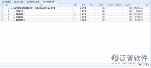在圖-<支出合同.控制指標(biāo)>中,從目標(biāo)成本中選擇某分項(xiàng)工程,雙方就此分項(xiàng)工程簽訂合同。點(diǎn)擊保存。