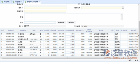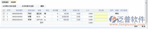 若支出合同為采購類合同,如上圖-<支出合同.采購單>所示,點(diǎn)擊采購單,從采購計(jì)劃中選擇或者直接從材料庫中選擇材料,輸入數(shù)量、采購價(jià)格及供應(yīng)商,點(diǎn)擊保存即可。