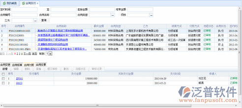 在圖-<合同支付.瀏覽>界面,上半部分是按照時(shí)間錄入的先后順序排列的主合同列表,下半部分的激活的當(dāng)前標(biāo)簽是<合同付款>,顯示當(dāng)前最新通過或者駁回的合同付款單。