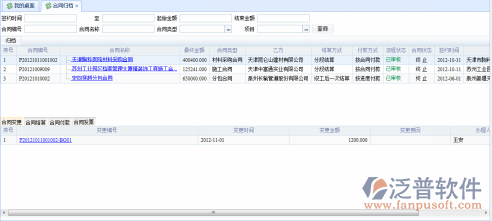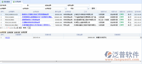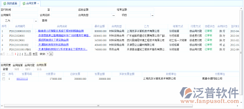 合同檔案僅顯示已經(jīng)歸檔的合同,選擇某個(gè)已經(jīng)歸檔的合同,其變更、結(jié)算、付款和發(fā)票信息也會(huì)相應(yīng)顯示出來。