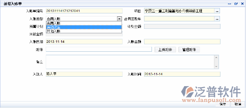 登錄項目管理系統(tǒng),點擊功能菜單,選擇資金管理->收支入賬->收入記賬,如下圖所示: