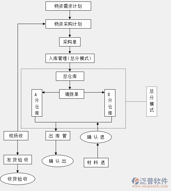 總分模式:適用于集中采購模式下的庫存管理;在這種模式下,公司總部設(shè)總庫(非獨(dú)立核算總庫),沒有實(shí)體總庫可設(shè)虛擬總庫,各項(xiàng)目設(shè)分庫(非獨(dú)立核算倉庫),沒有實(shí)體分庫,可設(shè)虛擬分庫。項(xiàng)目分庫一定所屬某個(gè)總庫(虛擬總庫);每個(gè)虛擬總庫可以下設(shè)N個(gè)項(xiàng)目分庫;項(xiàng)目分庫原則上只核算數(shù)量,金額核算均在虛擬總倉庫產(chǎn)生??偡帜J较拢値煊胁少徣霂鞕?quán),分庫只有調(diào)撥入庫權(quán),沒有采購入庫權(quán);分庫之間不允許直接進(jìn)行調(diào)撥,如需調(diào)撥,則必須經(jīng)由分庫到總庫,經(jīng)由總庫進(jìn)行調(diào)撥。