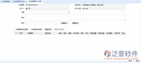 在圖-<物資需求計(jì)劃.瀏覽>界面,左邊是項(xiàng)目樹,右邊是以單據(jù)表格的形式顯示了物資需求計(jì)劃的列表,如:物資需求計(jì)劃單號(hào)、流程狀態(tài)、附件、說明等;界面頂部是查詢條件和操作面板,在界面左邊的項(xiàng)目列表中選擇一個(gè)項(xiàng)目,單擊頂部的“新增”功能按鈕,系統(tǒng)彈出如下圖-<物資需求計(jì)劃.新增>界面: