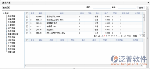 在圖-<機械器具計劃編制.瀏覽>界面中,填寫進場時間、出場時間、等相關信息,計劃編號自動生成也可手工填寫。點擊“增加機械設備”按鈕,系統(tǒng)轉入資源庫界面,如下圖:
