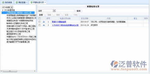 登錄項目管理系統(tǒng),點擊功能菜單,質(zhì)量管理->工程質(zhì)量監(jiān)督->質(zhì)量檢查記錄,系統(tǒng)轉(zhuǎn)入質(zhì)量檢查記錄列表,系統(tǒng)瀏覽窗口如下: