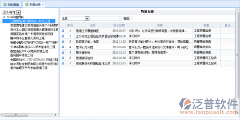 登錄項目管理系統(tǒng),點擊功能菜單,質(zhì)量管理->質(zhì)量臺帳->質(zhì)量臺帳,系統(tǒng)轉(zhuǎn)入質(zhì)量臺帳信息列表,系統(tǒng)瀏覽窗口如下:
