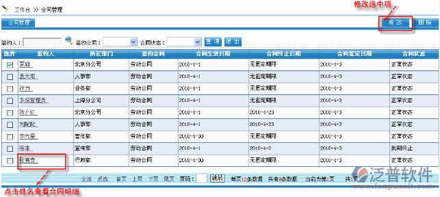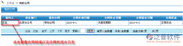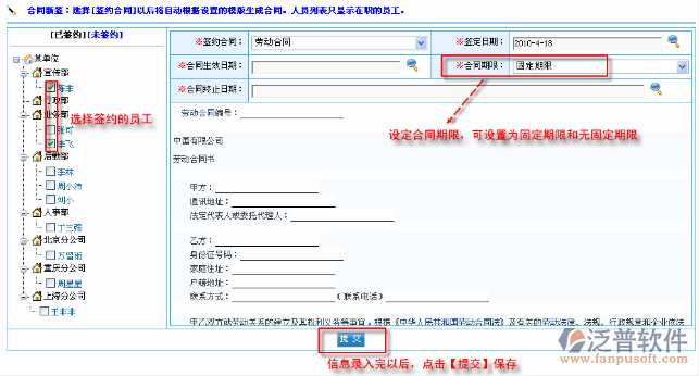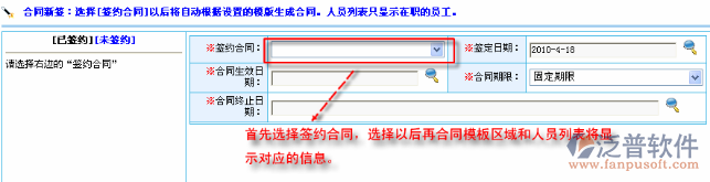 第二步,選擇要簽約的合同,選擇以后頁面上出現(xiàn)人員列表和合同的明細,如圖: