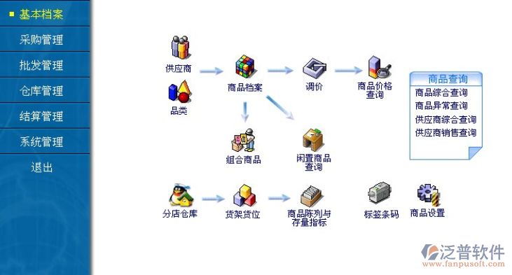 倉庫管理:物流與資金流核心管理區(qū)域,反映商品的出、入流程與流向以及庫存的成本和銷售金額等。