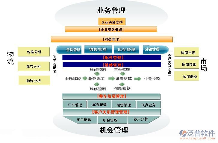 配件銷售、售后服務(wù)、整車貿(mào)易、信息反饋各流程緊密聯(lián)系,管理可總可分。