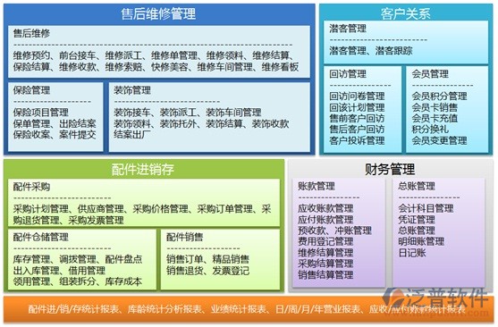 解決方案覆蓋了售后維修服務(wù)、配件進(jìn)銷存管理、客戶關(guān)系、會(huì)員管理、財(cái)務(wù)管理以及相關(guān)報(bào)表統(tǒng)計(jì)與分析等,同時(shí)我們還提供了與周邊系統(tǒng)的接口,如財(cái)務(wù)系統(tǒng)等。