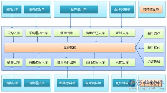 配件業(yè)務包含采購、銷售以及倉儲管理,其中倉儲管理包含有出入庫業(yè)務、庫內盤點與移位管理、組裝拆解管理、調撥管理,庫存管理、維修與裝璜領料管理、內部借用管理。