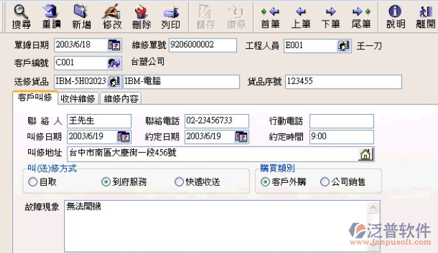 售后服務(wù)管理軟件根據(jù)來電馬上得到客戶的詳細(xì)資料,購買意向,銷售記錄,售后服務(wù)記錄,投訴/建議記錄,回訪記錄,迅速完成客戶的報(bào)修,更好的為客戶服務(wù)。泛普軟件的售后管理系統(tǒng)功能強(qiáng)大的處理流程和統(tǒng)計(jì)報(bào)表會(huì)成為各類售后服務(wù)企業(yè)的好幫手。本軟件可用于售后服務(wù)企業(yè)的呼叫中心軟件來使用,操作和使用上都比較容易上手。