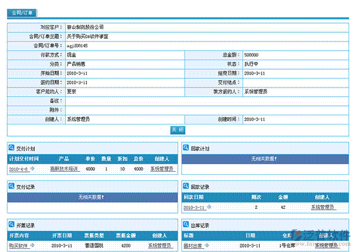 合同信息管理:記錄合同的主要信息,包括合同編號、合同類別、簽單日期、合同的甲方乙方、雙方的簽約人、合同金額,預計合同毛利等;記錄合同的條款、相關(guān)產(chǎn)品、特殊需求等信息;
