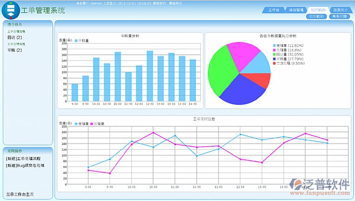 在工作臺(tái)首頁會(huì)實(shí)時(shí)顯示當(dāng)前的受理工單量、處理量和超時(shí)工單量等圖表