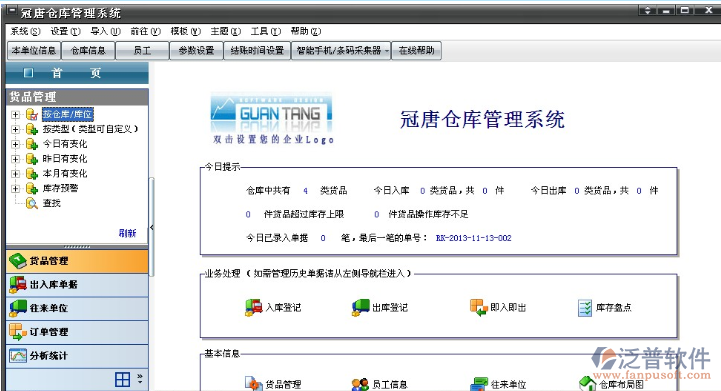 冠唐倉庫管理系統(tǒng)是一款通用的企業(yè)倉庫管理軟件,集進(jìn)倉、出倉和庫存管理為一體,用戶只需簡單的記錄貨品信息和出入庫單據(jù),系統(tǒng)自動根據(jù)每筆出入庫記錄自動完成貨品的庫存增減,自動分類統(tǒng)計,統(tǒng)計任一時間的進(jìn)倉、出倉等匯總數(shù)據(jù),物品庫存數(shù)據(jù)一目了然。另外,您還可以能記錄不同供應(yīng)商、不同貨品的采購價格,并對庫存不足和庫存積壓等自動提示等。