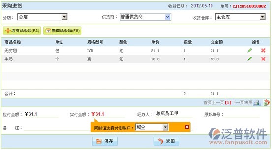 | 1.1、采購(gòu)進(jìn)貨/退貨:下圖是采購(gòu)進(jìn)貨操作界面 |