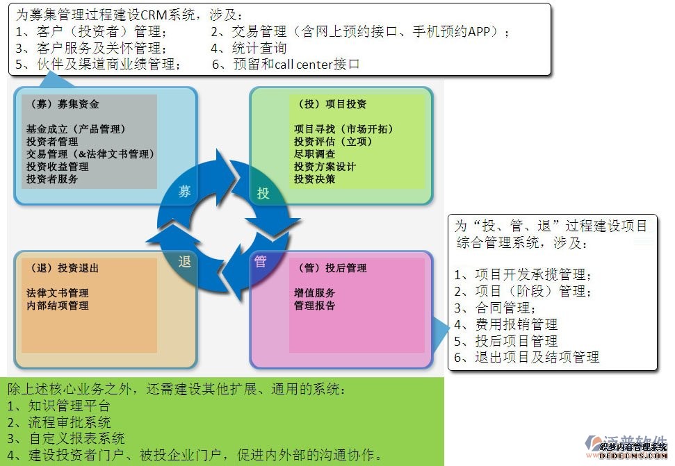 對投資項目的開發(fā)承攬、立項、內(nèi)核、商務計劃書審核、投資決策、投后項目投管規(guī)劃及執(zhí)行、業(yè)績及KPI匯報、項目退出全過程進行管理。涵蓋了項目過程中:人、部門、客戶、項目、收入、費用、關鍵節(jié)點、文檔、管理控制等各個要素。