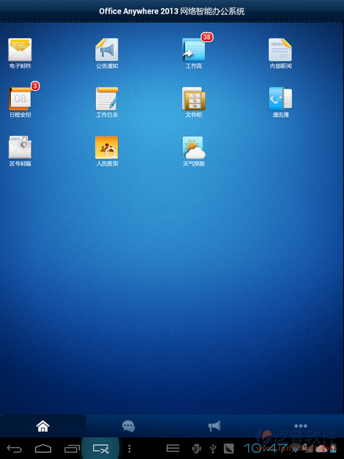 此外,隨著越來越多大屏幕手機(jī)的面世以及更多Android平板電腦的普及,對于大屏幕設(shè)備的兼容也變得越來越重要。在本次更新后,Android手機(jī)版能夠在更多尺寸的屏幕下正常顯示,在大尺寸屏幕設(shè)備上,通達(dá)OA精靈Android移動(dòng)版都能夠?qū)崿F(xiàn)很好的界面效果,不會(huì)再出現(xiàn)無法充滿全屏或者界面被強(qiáng)制放大的現(xiàn)象。下圖為E人E本平板電腦上的運(yùn)行效果。