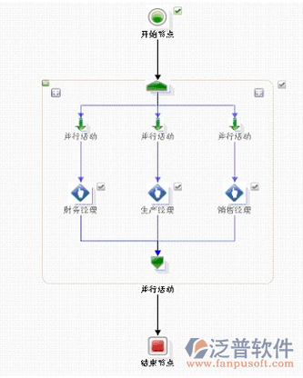 如設計一個會簽審批的流程,財務經(jīng)理、生產(chǎn)經(jīng)理、銷售經(jīng)理同步從各自的管轄維度出發(fā)審批,其結構如下: