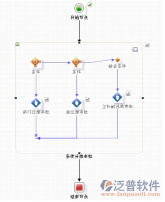 如設計一個條件分派審批流程,按金額的大小范圍審批,5000及以下由部門經(jīng)理審批、5000到10000由總經(jīng)理審批、其它金額(即大于10000)由主管副總裁審批。結構如下: