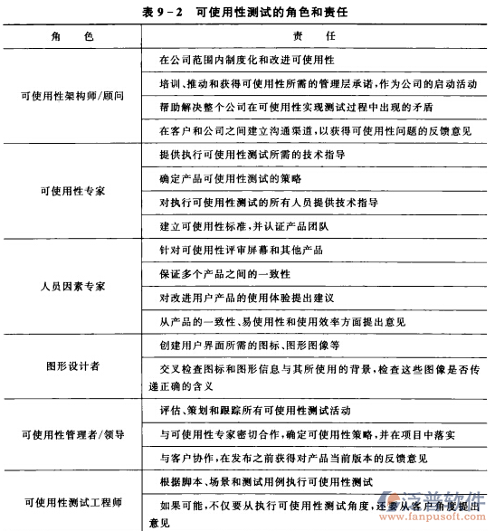 因此,泛普軟件建議可以從測(cè)試團(tuán)隊(duì)之外的客戶代表中選擇一部分人進(jìn)行可使用性測(cè)試。邀請(qǐng)了解用戶想要什么和客戶預(yù)期的面對(duì)客戶的團(tuán)隊(duì)(例如客戶支持、產(chǎn)品市場(chǎng)開(kāi)發(fā)人員),可提高可使用測(cè)試的有效性。表9-2歸納了可使用性測(cè)試的不同角色的技能和預(yù)期。