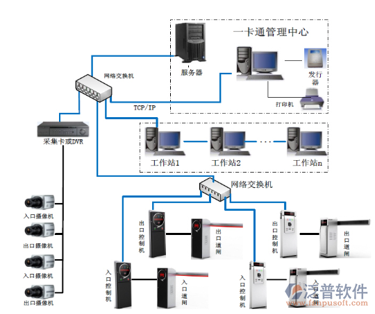 泛普軟件停車場收費(fèi)管理系統(tǒng)由出入口控制機(jī)、出入口自動(dòng)道閘、出入口監(jiān)控和抓拍攝像機(jī)、視頻捕捉卡或DVR、通訊轉(zhuǎn)換器或網(wǎng)絡(luò)交換機(jī)和管理電腦組成。系統(tǒng)聯(lián)網(wǎng)結(jié)構(gòu)圖如下。